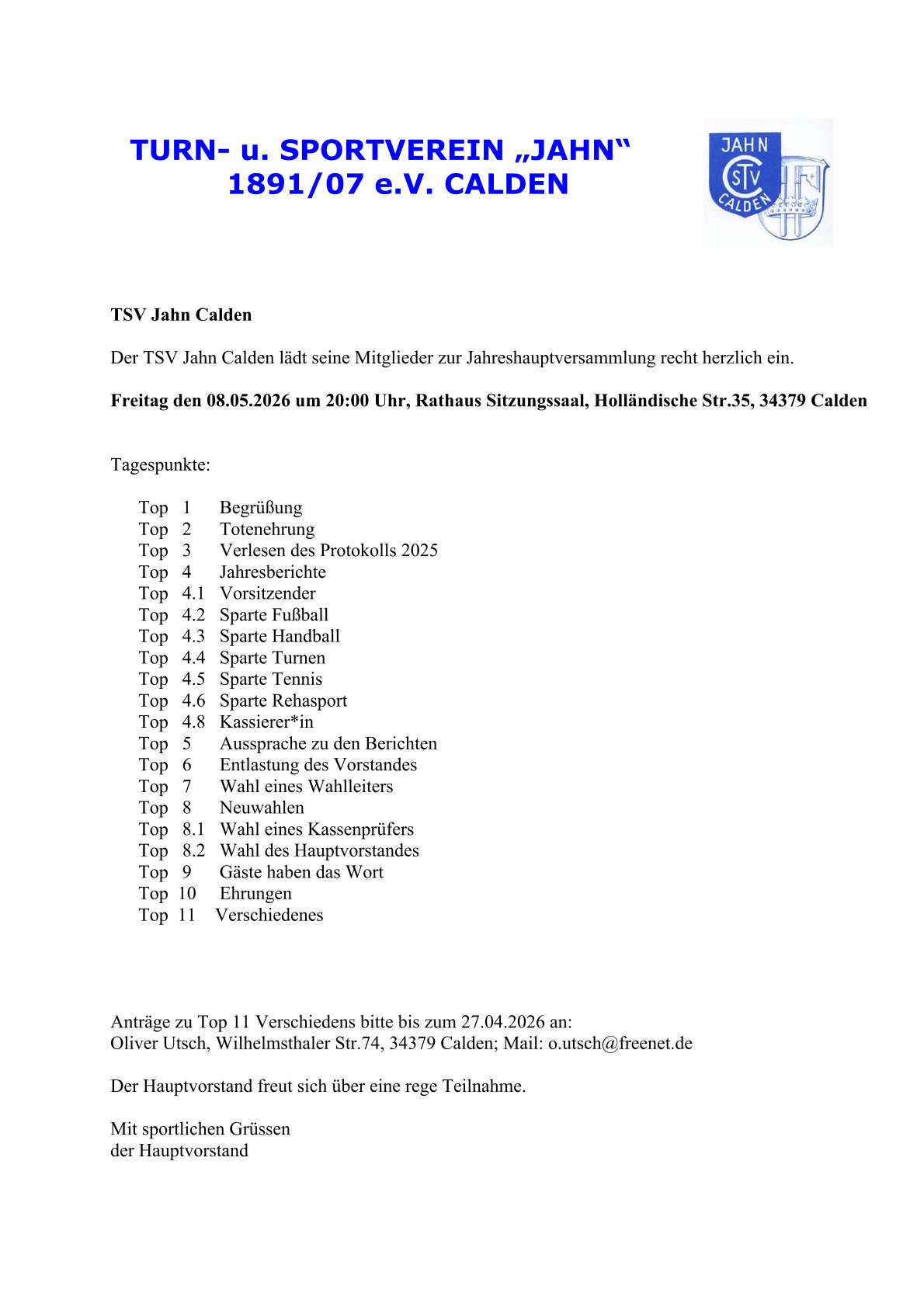 Jahreshauptversammlung 2026 Zeige grösseres Bild Von Admin TSV Jahn|2026-03-26T06:15:16+01:00März 26th, 2026|Sparten|0 Kommentare Teile diesen Beitrag in den sozialen Medien! FacebookXWhatsAppE-Mail Hinterlasse einen Kommentar Antwort abbrechenKommentar Meinen Namen, E-Mail und Website in diesem Browser speichern, bis ich wieder kommentiere.